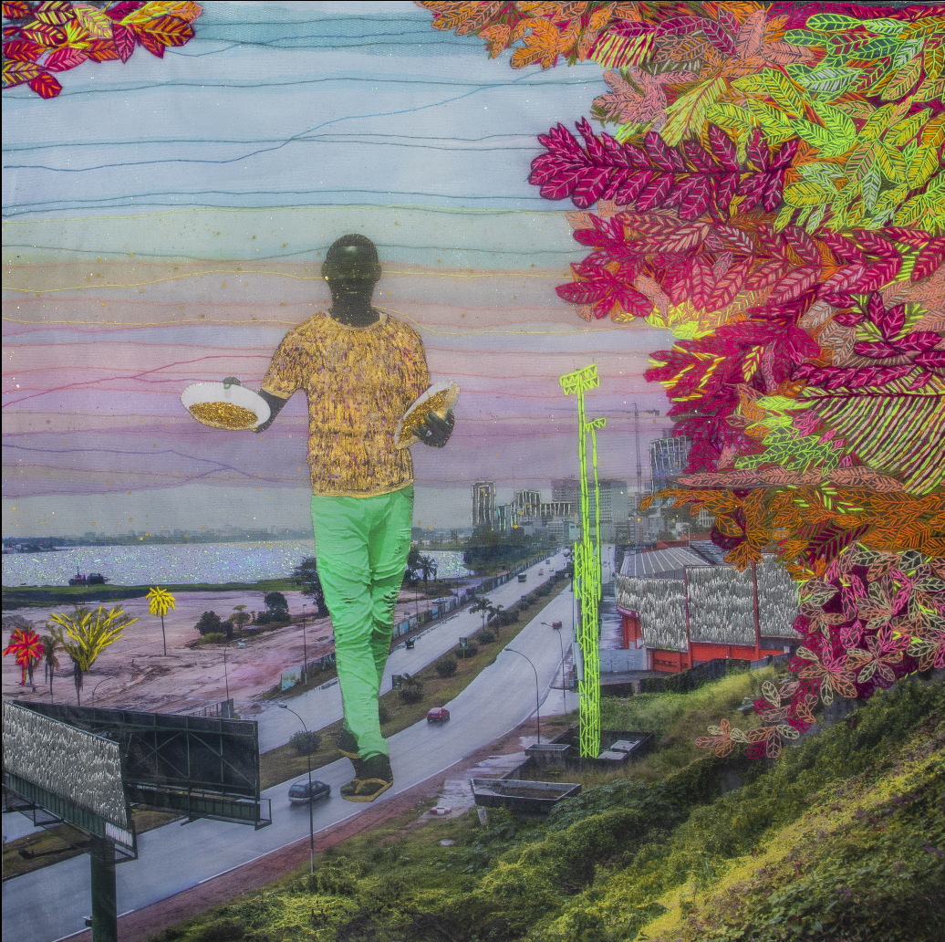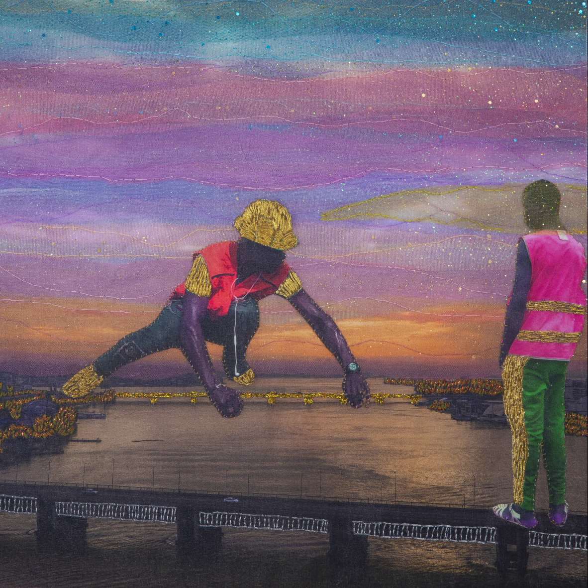 She has taken the habit of taking pictures of the landscapes that amaze her every morning, rigorously between 5 and 7 a.m. Afterward, using a mixed technique of collage, embroidery, quilting and photomontage, she superimposes on them several layers of ethereal fabrics intertwined with other images she takes during those walks, like silhouettes of passers-by's, street photographs or stills.